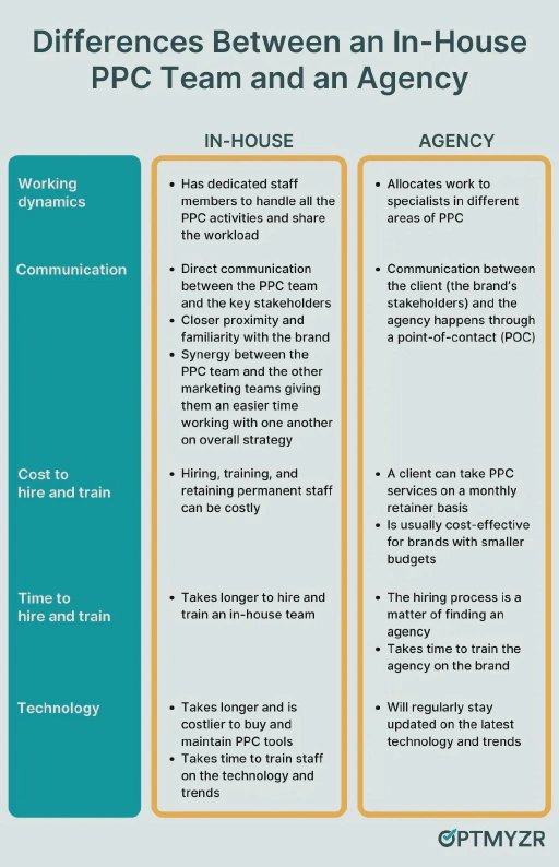 Before learning how to build your in-house PPC team, it’s essential to understand the differences between an in-house PPC team and an agency, and when to choose what.