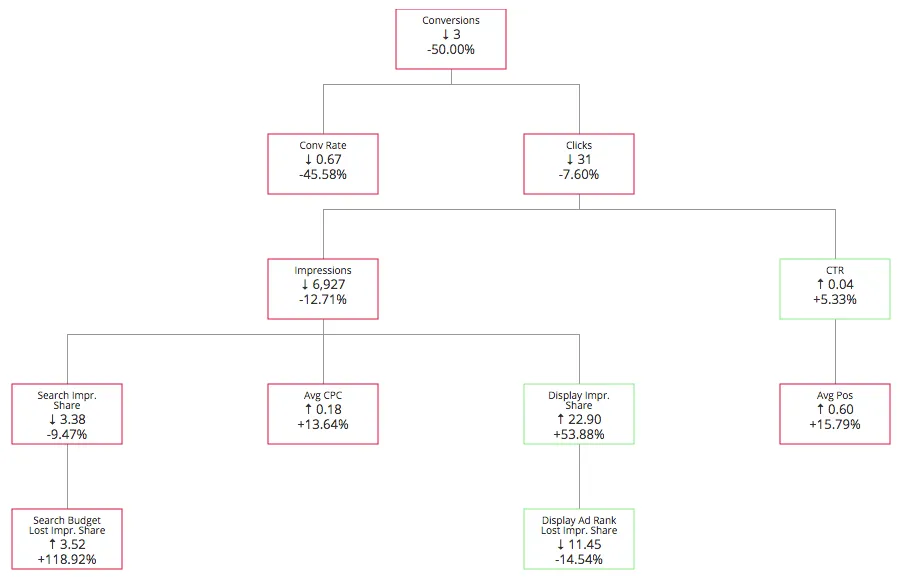 The concept of this tool is that every metric depends on other underlying metrics and rather than randomly hunting in your account for things that are different we show potential causality. For example, if clicks are down like in the example above, we highlight that fact in red and show the underlying related metrics: impressions and CTR. In this case, CTR is not an issue (it’s green), so we look further down the tree to see that impressions are down because IS lost due to budget has increased dramatically. From this visualization, we can quickly determine that raising the budget and taking a look at the conversion rate of the landing pages should help restore conversions to this account.
