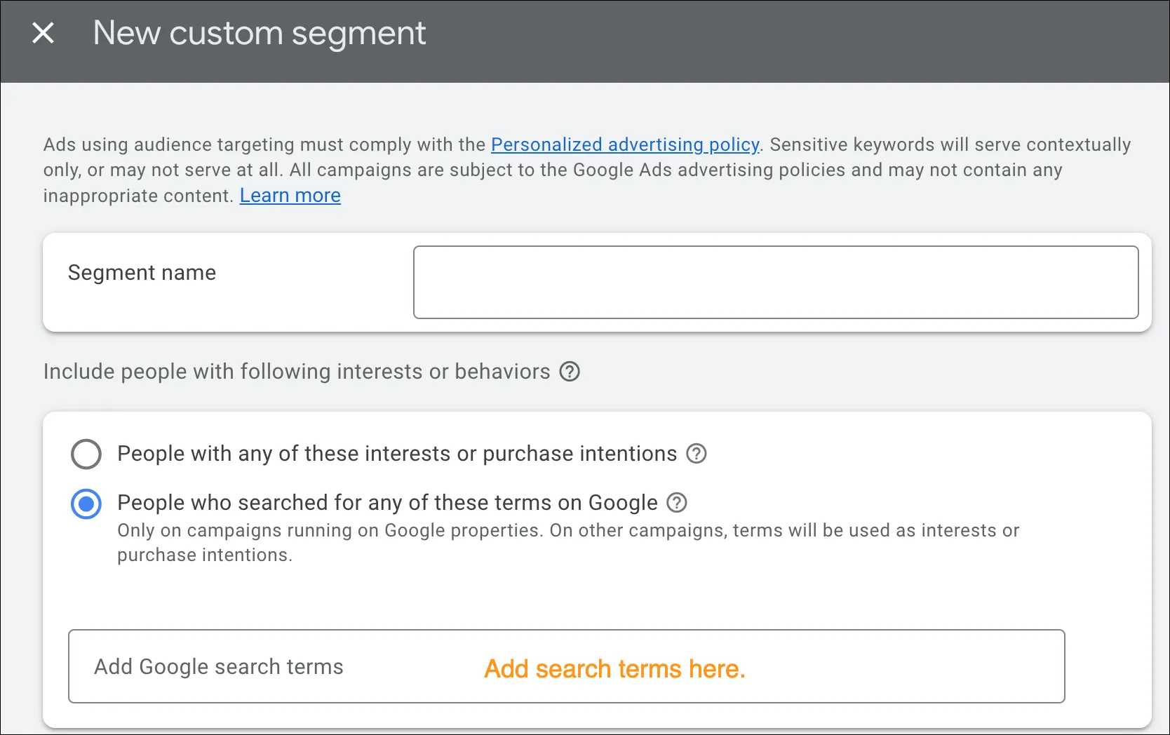Google says, “To enhance machine learning, use search term-based custom segments”. So, let’s look at that first. As described, custom segments are based on what people search for, and to use this in the audience signal, you can add the search terms that you think your audience will look out for on Google.