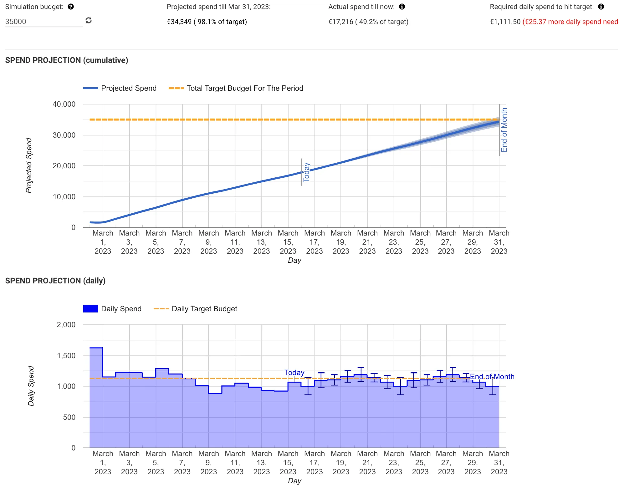 Use the Spend Projection to view daily and monthly spend patterns and to predict how much your Performance Max campaigns are likely to spend by the end of the budget cycle. By inserting your target budget, you’ll also see how much under or over the target the campaigns are likely to spend.