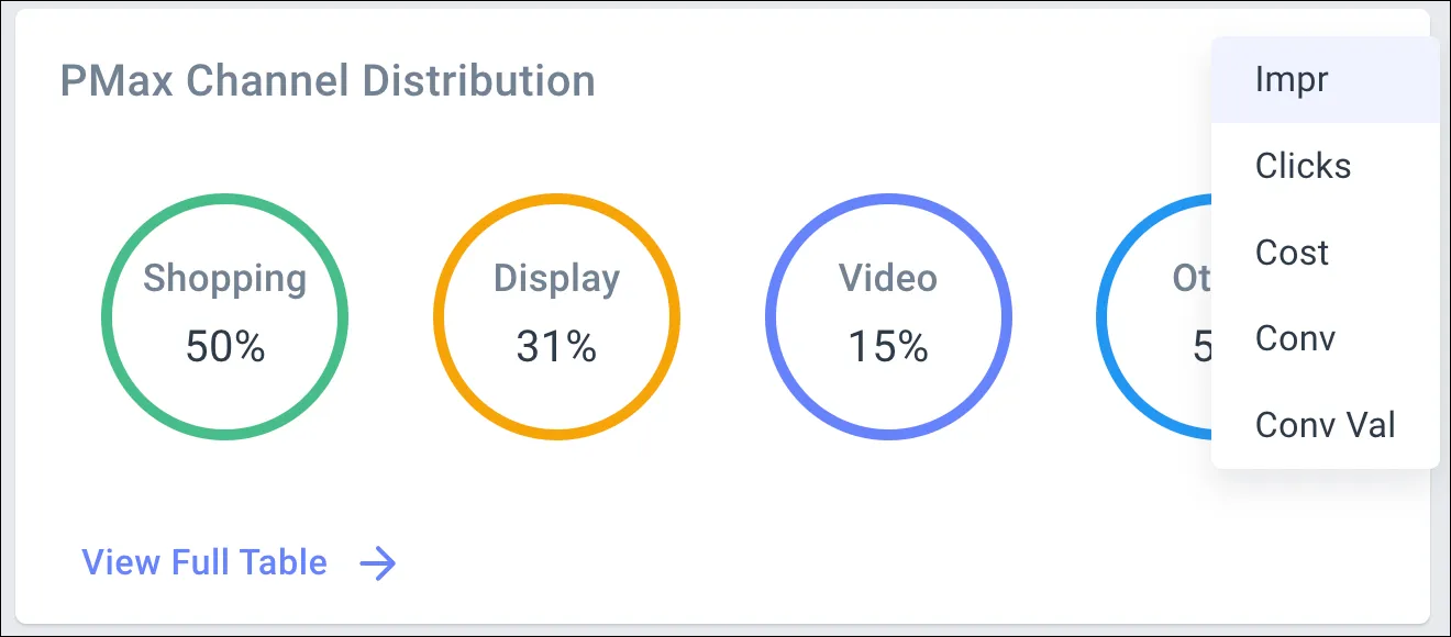 You can use the new widget on the Account Dashboard to classify the performance of all the Performance Max campaigns in the account across 4 different channels: Shopping, Display, Video, and Other (which includes Search, Gmail, Discovery, Maps).