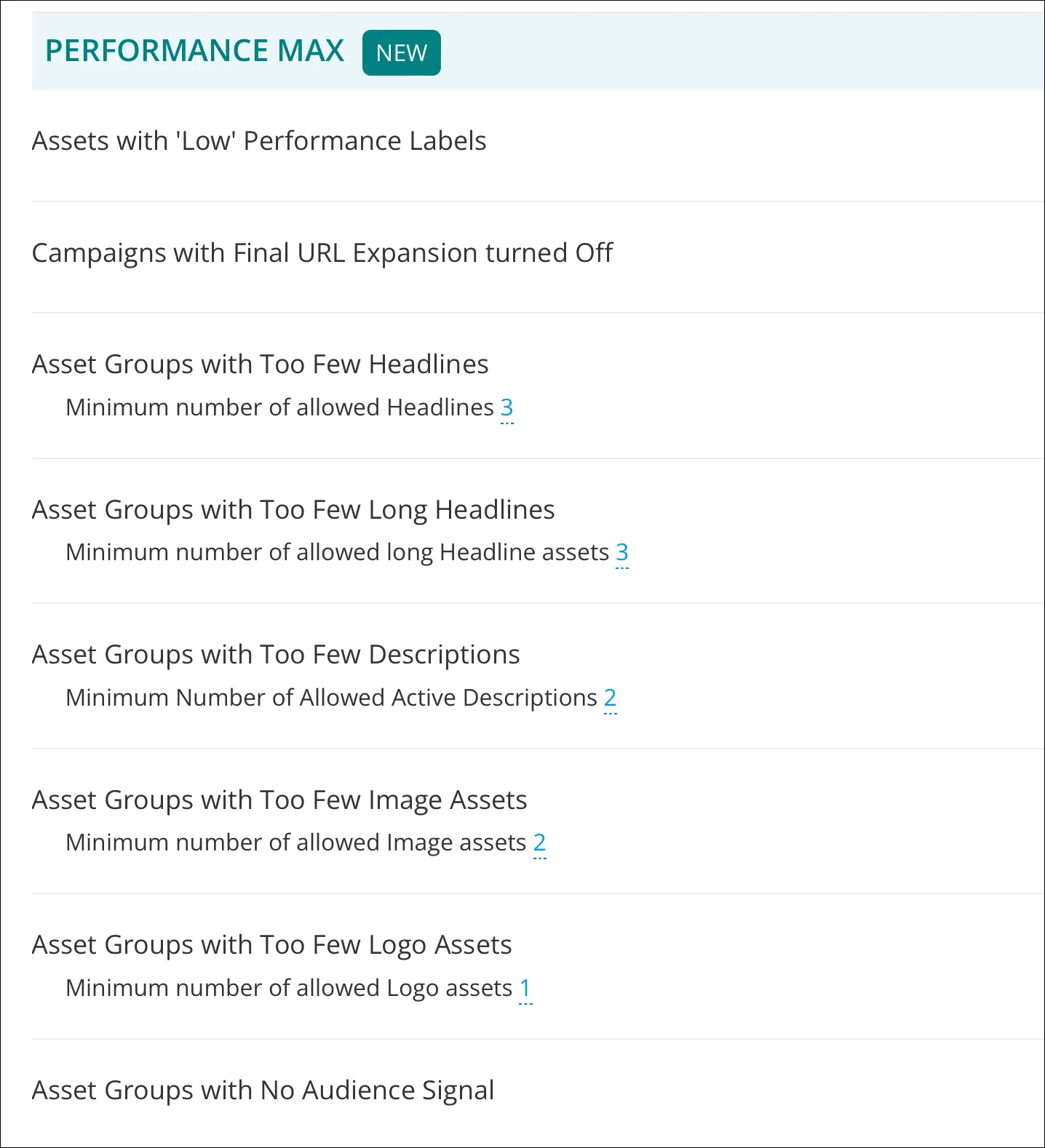 Performance Max campaigns are dependent on assets for their performance, so missing out on them is not advisable. You can use Optmyzr audits to find any missing components from your Performance Max campaigns.