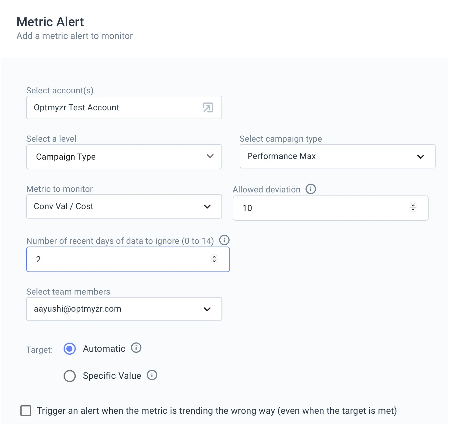 Being the black box Performance Max is, often the performance changes overnight and it would make sense to stay on top of these changes. You can track metrics like Impressions, clicks, conversions, or your own custom metrics using alerts in Optmyzr.