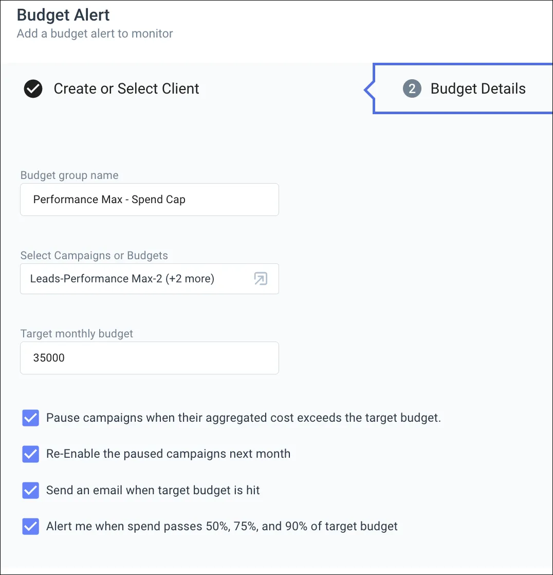 To make sure your Performance Max campaigns don’t overspend, you can create a Multi-account budget alert that allows you to group together all the budgets you’d like to track together and assign a spend cap for them.