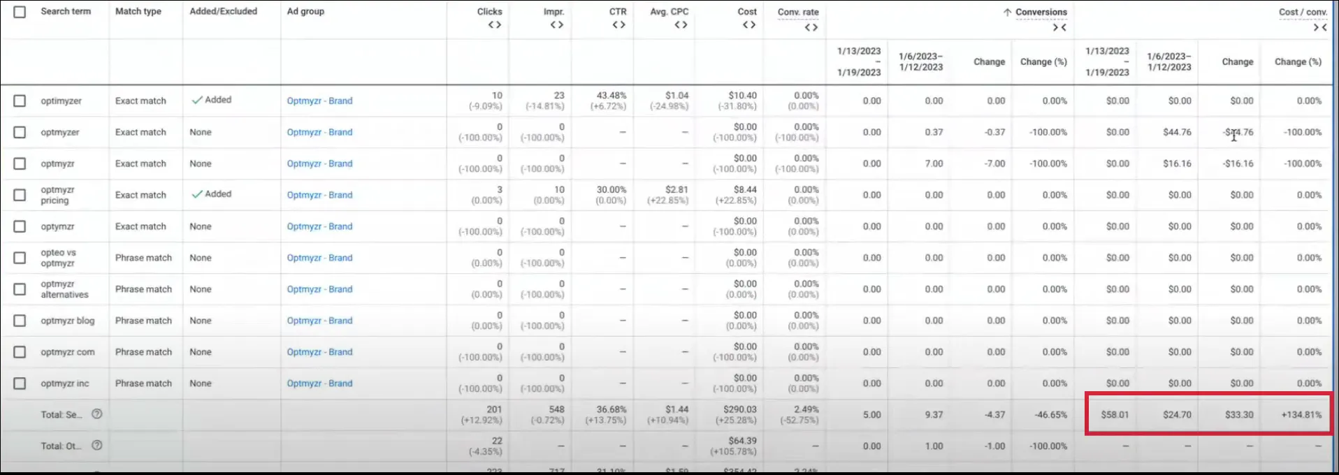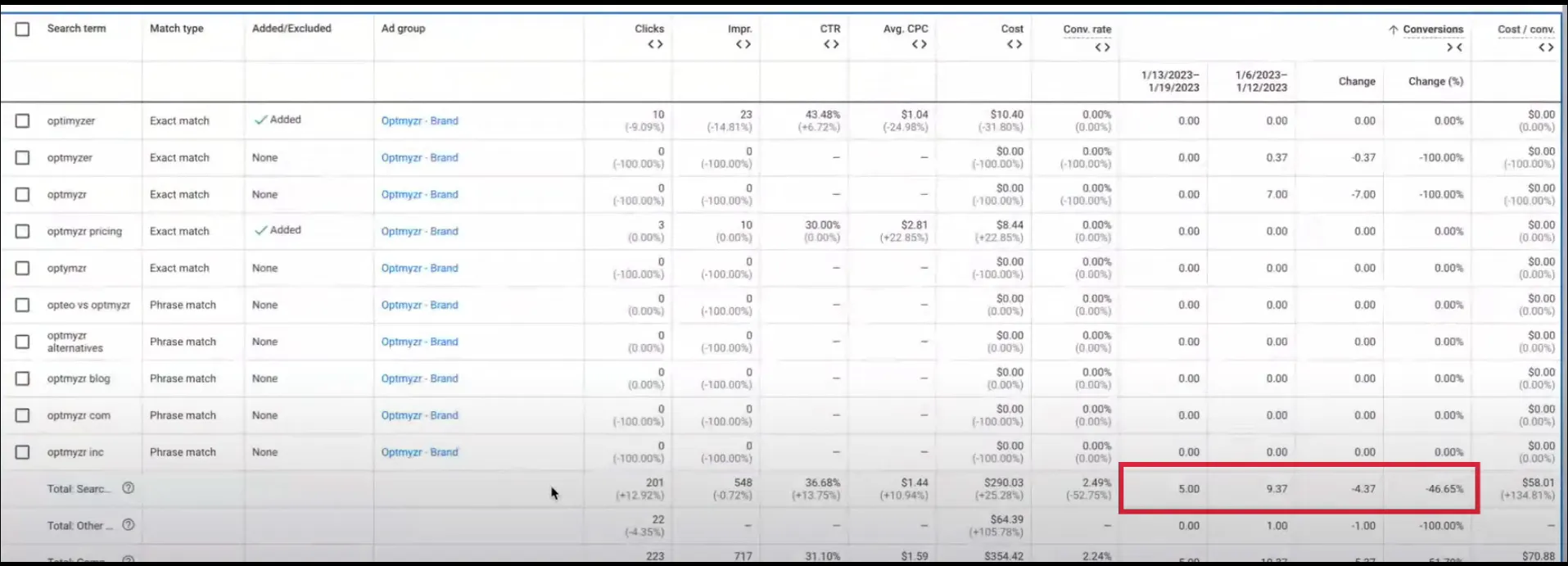 We looked at our Google Ads account and found that our brand keyword, ‘Optmyzr’ all of a sudden wasn’t driving any more conversions.