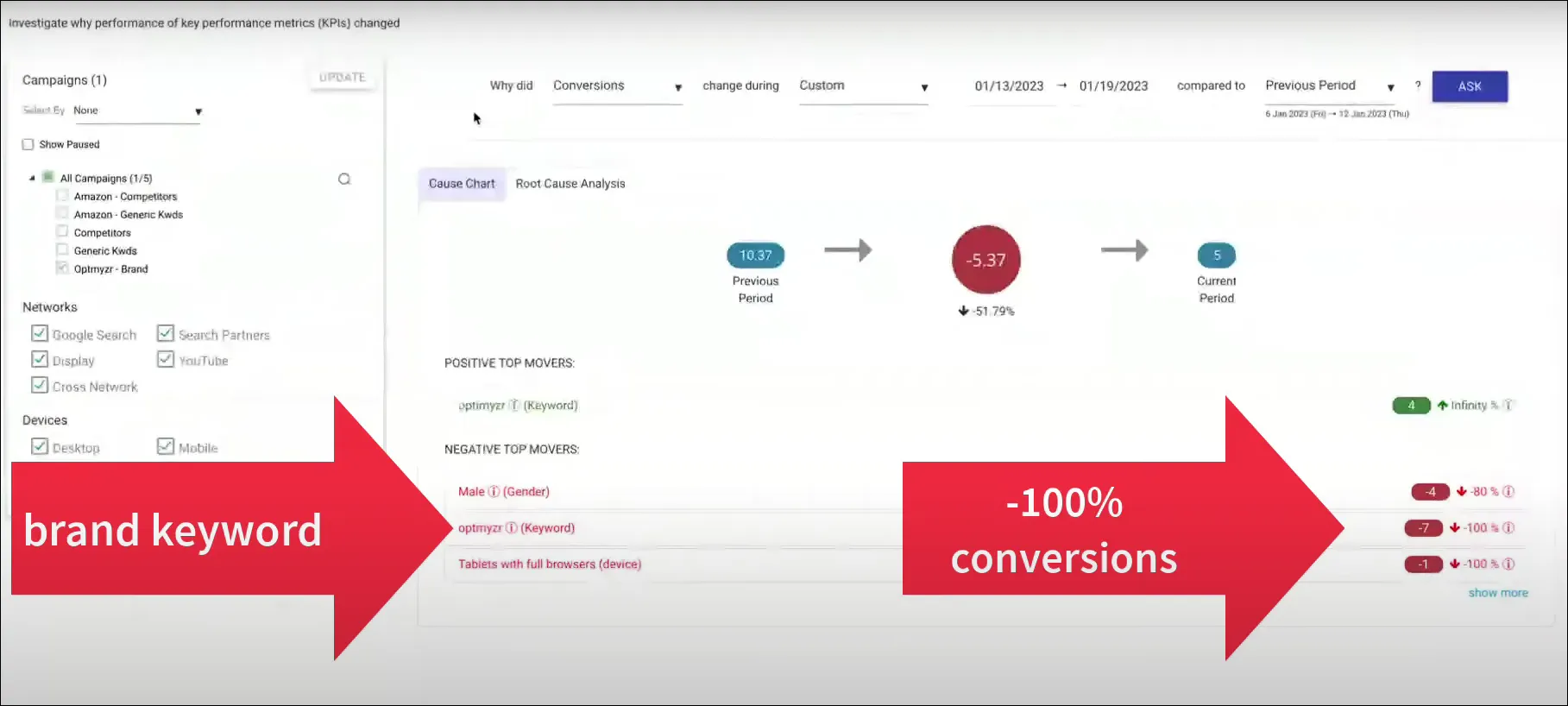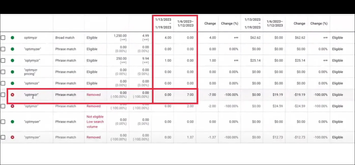As you can see the keyword, ‘Optmyzr’, was driving 7 conversions before it was removed. And after it was removed by Google, it had no more conversions.