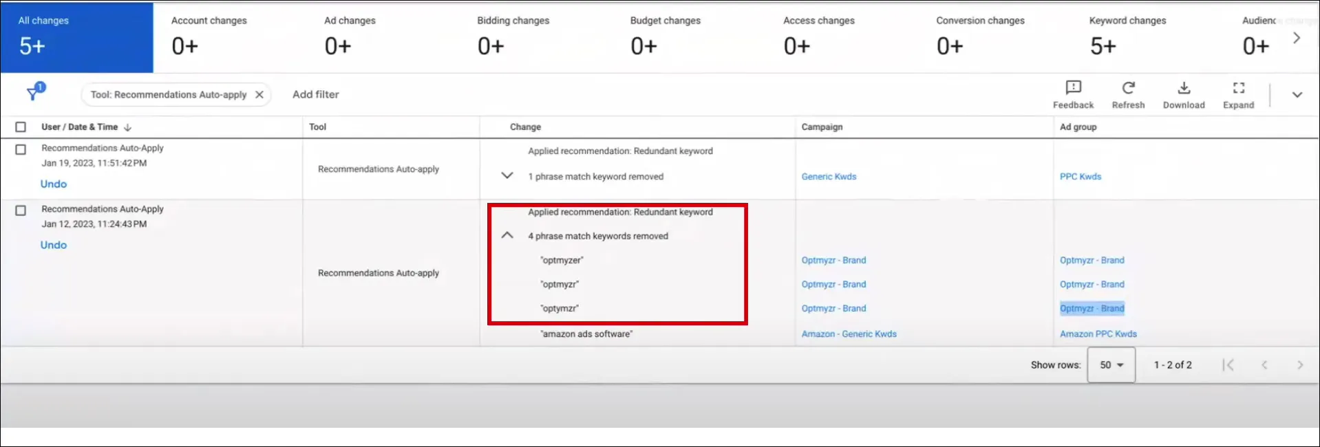 We jumped into our Google Ads account and went to the automatically applied recommendation history to investigate, and here’s what we found.