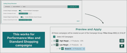 By using both you can build multiple Shopping or Performance Max campaigns with consistent and advanced structures in just seconds, while also automatically keeping them up to date by adding new ad groups, product groups, and even campaigns based on your inventory content.