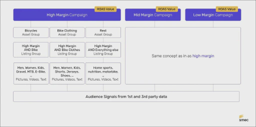 If your client has a low SKU-volume store with maybe five or ten products, you may create one campaign with one or two asset groups. If they have a larger store with hundreds or thousands of products, you could split it out a bit more into separate themes for more control over what products are taking up the bulk of the ad spend.