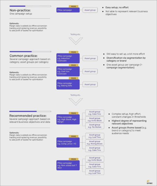 He says that if you’re new or are still testing Performance Max you can take a simpler approach to structure your campaign and move towards a more granular approach as you learn going forward.