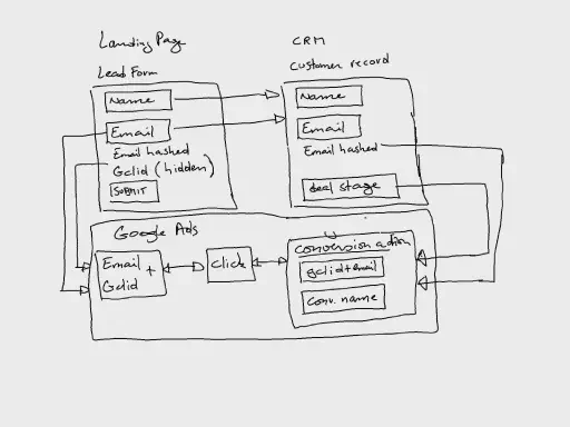 As the illustration shows, the advertiser gets to use a unique piece of customer information of their own to connect a Google click with different conversion stages in their CRM. And what better piece of unique lead data than someone’s email? It’s nearly always the first thing a lead form asks, so nearly every advertiser has it available.