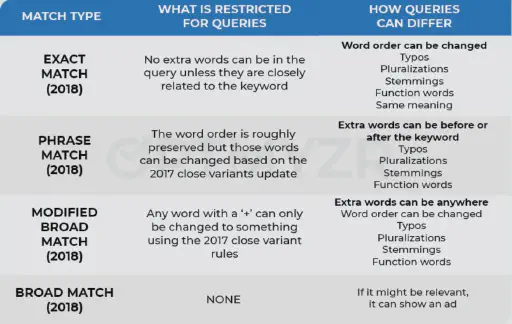 For example, in 2018 they announced that Phrase Match could also trigger ads even if the keywords are closely related e.g. as a typo, pluralization, stemming, or by the addition of articles like ‘in’, ‘of’, etc.
