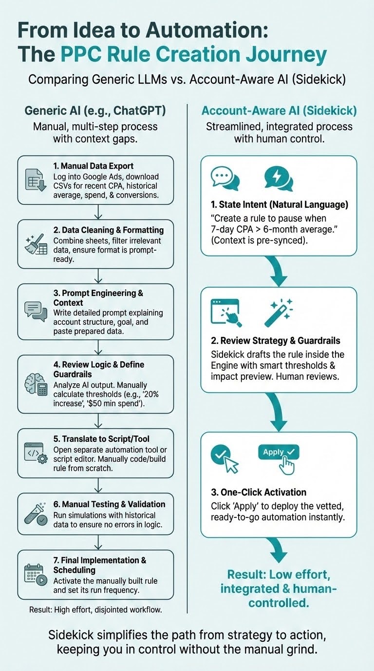 Das ist der entscheidende Unterschied. Generische KI kann Ihnen helfen, eine PPC-Strategie zu durchdenken. Sidekick hilft Ihnen, diese Strategie in eine funktionierende Automatisierung innerhalb Ihres Kontos zu verwandeln.