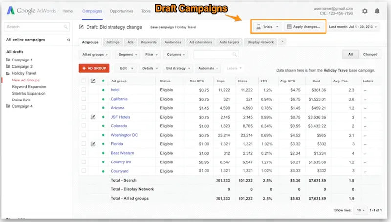 Verwandeln Sie die Daten in Kreisdiagramme, Balkendiagramme oder Liniendiagramme. Entwürfe und Experimente: Sie können jetzt neue Änderungen an Ihrem Konto vorbereiten, bevor Sie sie live schalten. Angenommen, Sie möchten einige neue Theorien testen… anstatt die Änderungen im Konto vorzunehmen, können Sie jetzt alles in einer vorbereiteten Version Ihres Kontos aufbauen und dann, wenn alle zustimmen, es als Experiment starten, bei dem Sie einen Prozentsatz des Traffics darauf lenken, sodass Sie einen direkten Vergleich der Kontroll- und Experimentergebnisse durchführen können. Es ist wie AdWords-Kampagnenexperimente, aber fortschrittlicher und hoffentlich einfacher zu verwenden. Zumindest von dem, was ich gesehen habe, als ich diese Funktion vor ein paar Monaten getestet habe, sollte sie ziemlich nützlich sein.