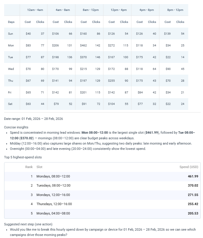 La mayoría de los anunciantes se preocupan por el exceso de gasto, pero el gasto insuficiente es igual de costoso. Si estás sentado sobre un presupuesto no utilizado mientras los competidores dominan la cuota de voz, estás dejando ingresos sobre la mesa. La herramienta señala ambos escenarios, para que sepas si debes reducir o acelerar.