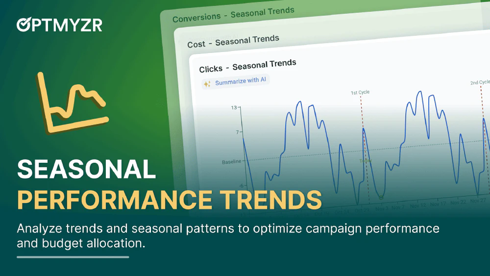 The Seasonal Performance Trends Tool is an insight-driven analysis tool for Google Ads accounts. It decomposes account-level performance metrics into two components, trend and seasonality, to help marketers understand long-term changes, recurring patterns, and irregular fluctuations in their PPC data for key metrics - Cost, Clicks, Conversions, and Conversion Value.